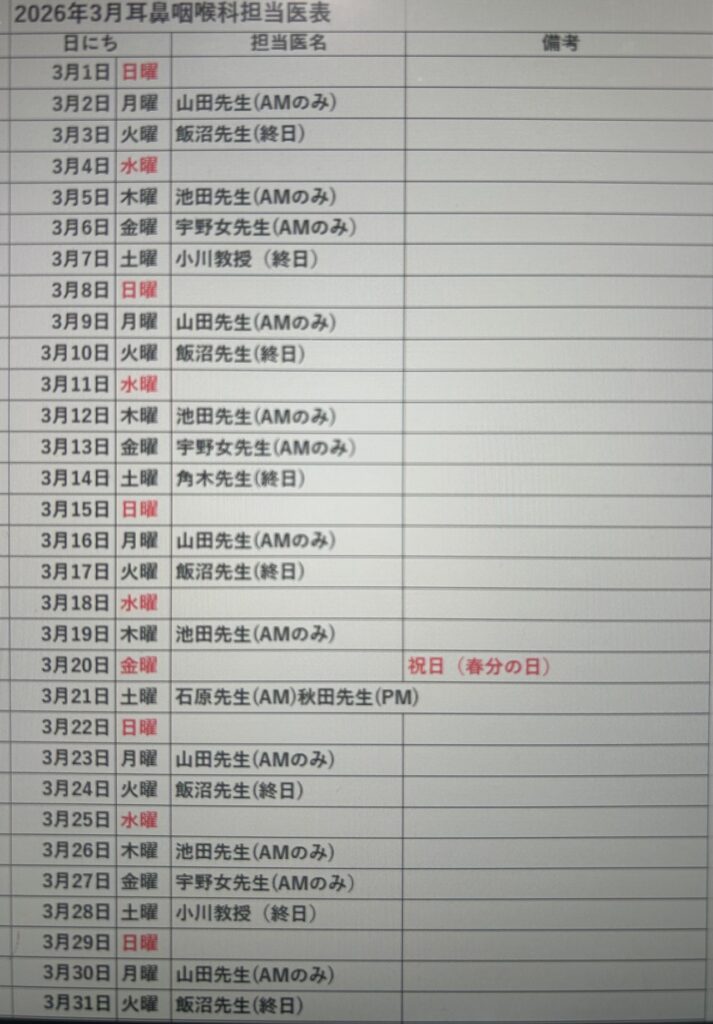 2026年1月からの耳鼻咽喉科木曜の担当医師について